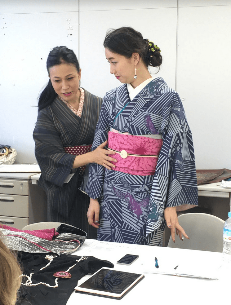 Right: Kimono dresser ms. Ishioka showing how to dress in kimono