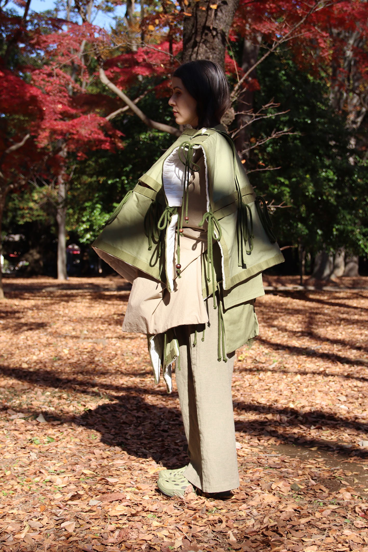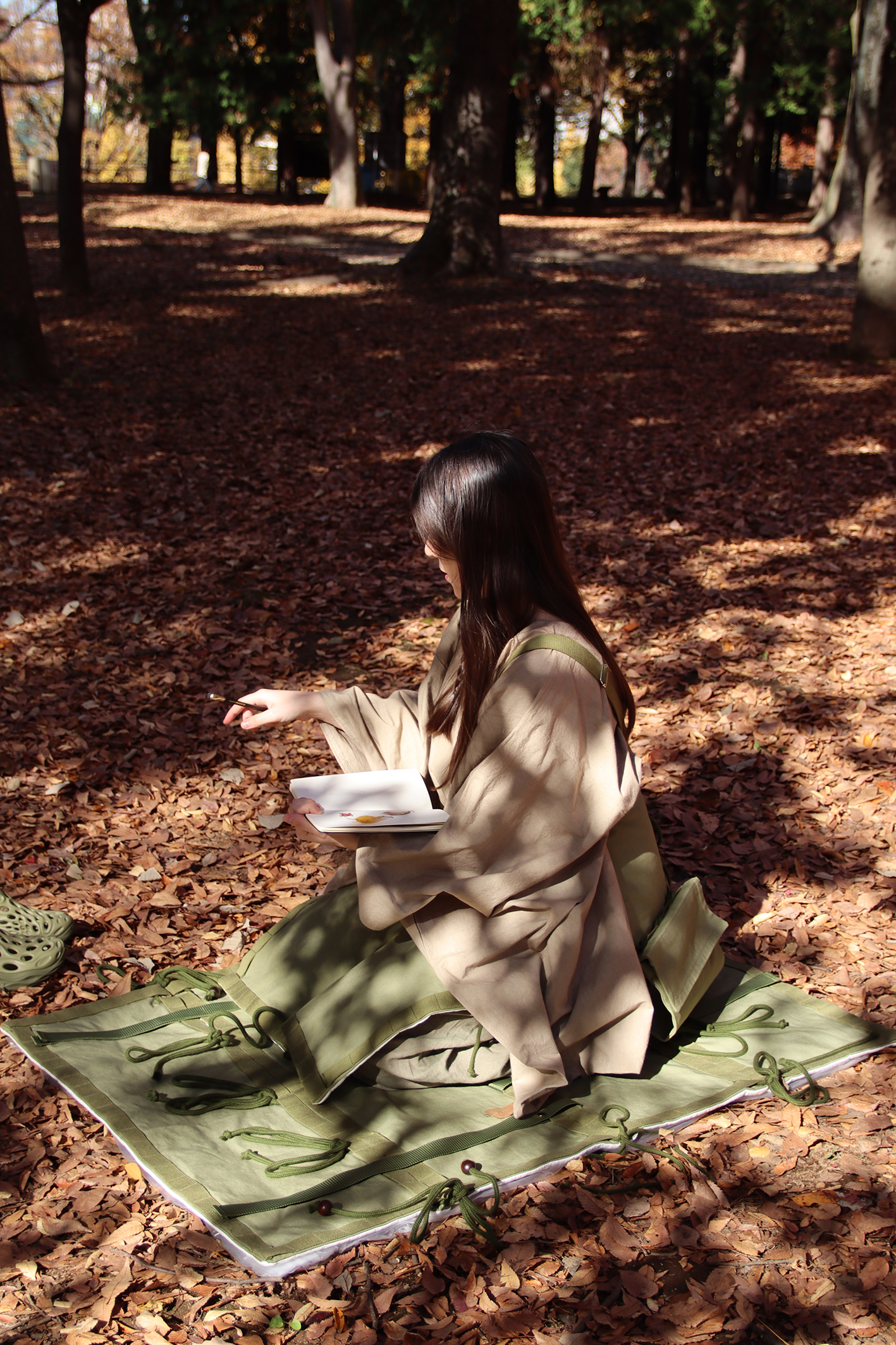 Based on the concept of a dress that can be worn for life, Alessia’s collection explores aesthetics and functionality through experimentation. It proposes a deeper connection between wearers, their clothing, and their bodies within the natural environment. Inspired by the construction of traditional Japanese clothing and the modular, transformative nature of Tatami, her collection consists of six modular rectangles that can be arranged to create multiple garment shapes.